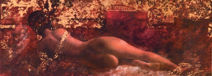 The high level of detail with which Freeman paints highlights the “icon-like” appearance of his figures. They are blended into his myriad of patterned backgrounds as if frozen in time. His colors are deeply rich, dark, and sumptuous and his frequent use of gold leaf is derived from the Byzantine tradition of decoration. Despite Freeman’s classical approach, his faces and figures speak to the viewer from an avant-garde perspective that references the late 20th century figurative style.