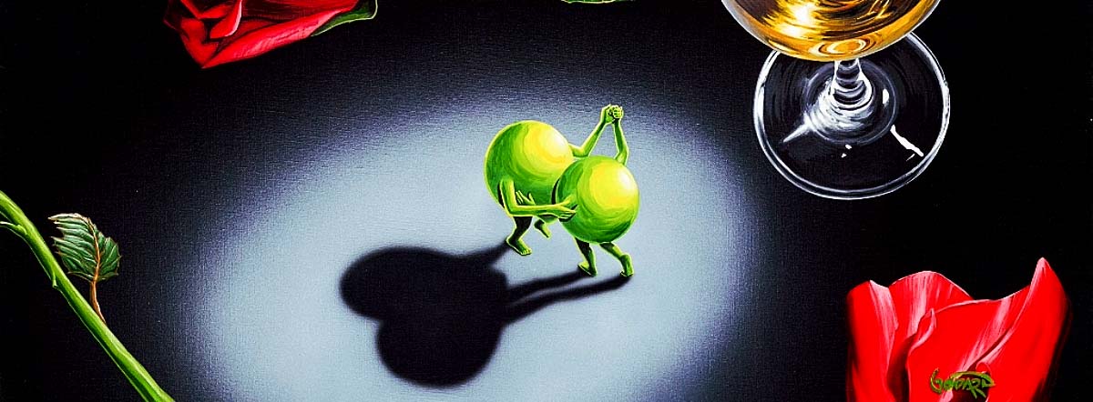 Laughter is a great equalizer. Like a cold beer or dirty martini, Michael Godard paintings offer the pause that refreshes. The spherical little characters, those olives and grapes and strawberries that he drops into so many of these potent visual cocktails, scramble across tabletops, dive into wine goblets and play electric guitars in an antic send-up of the conventional art scene. They are uniquely, of course, Godard’s own fertile imagination, his signature personages (legend has it that he did the first of his signature olives when a friend asked for a birthday painting celebrating the dirty martini), but they have their ancestors. Fans of animation will no doubt have their points of comparison for these round little rascals, but their helter-skelter energy also recalls one of the oddball geniuses of the Middle Ages, the diabolically inventive and talented (talk about brush precision) of Bosch. Both Godard and Bosch go all out for the slapstick and it would be a blast to hang the “Seven Deadly Sins”, one of Bosch’s most bizarre creations, with Godard’s tongue-in-cheek “Seven Deadly Zins” in all their Rat Pack suavity.
