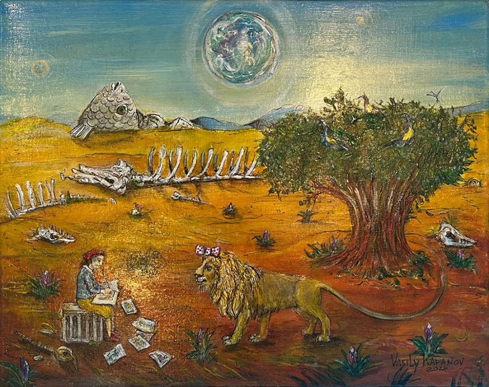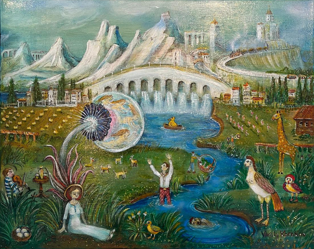 The artistic style of Vasily Kafanov is a blend of surrealism and symbolism, heavily influenced by the artist’s exposure to Commedia dell’Arte and the works of Hieronymus Bosch and Pieter Bruegel. The use of fish as a central motif in his work is tied to a fascination with alchemy and transformation, themes that resonate throughout his illustrious career. The works of Marc Chagall also had a significant impact on Kafanov, especially in his earlier years. While his style has evolved over the decades, it remains rooted in these early influences, combined with a deep appreciation for the mysteries of the world, both seen and unseen.