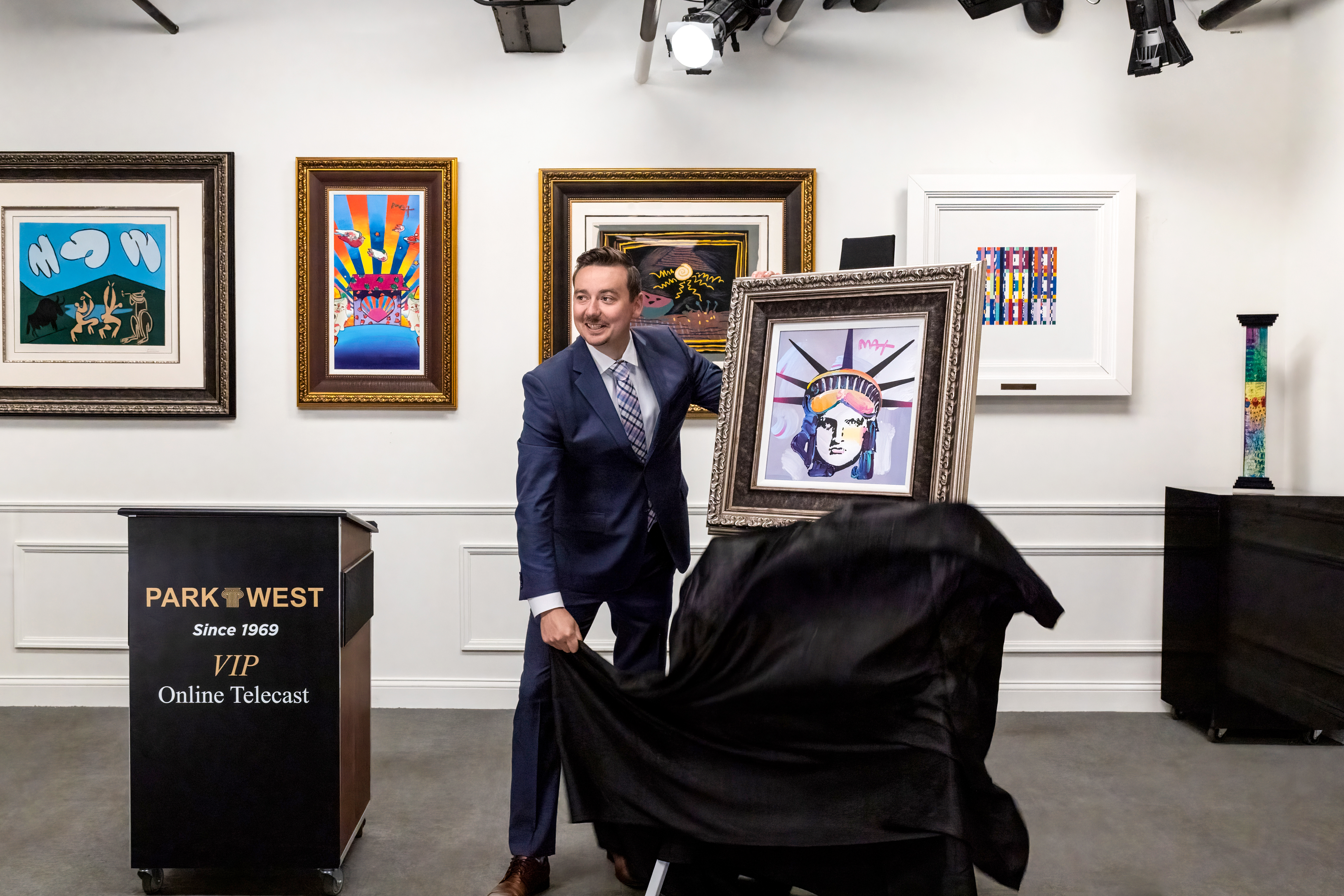 Cole Waters is no stranger to Park West art auctions. Since late 2016, the energetic and charming Waters could be found at VIP shows where he would delight Park West collectors while serving in the co-host role, adding color to the spectacle of these exclusive weekend events. In 2020, the auctioneer found a home at our online auctions, hosting live-streaming telecasts where he’d interact with collectors, introduce stunning works from world-famous artists of today, and bang his gavel down on thousands of winning bids.