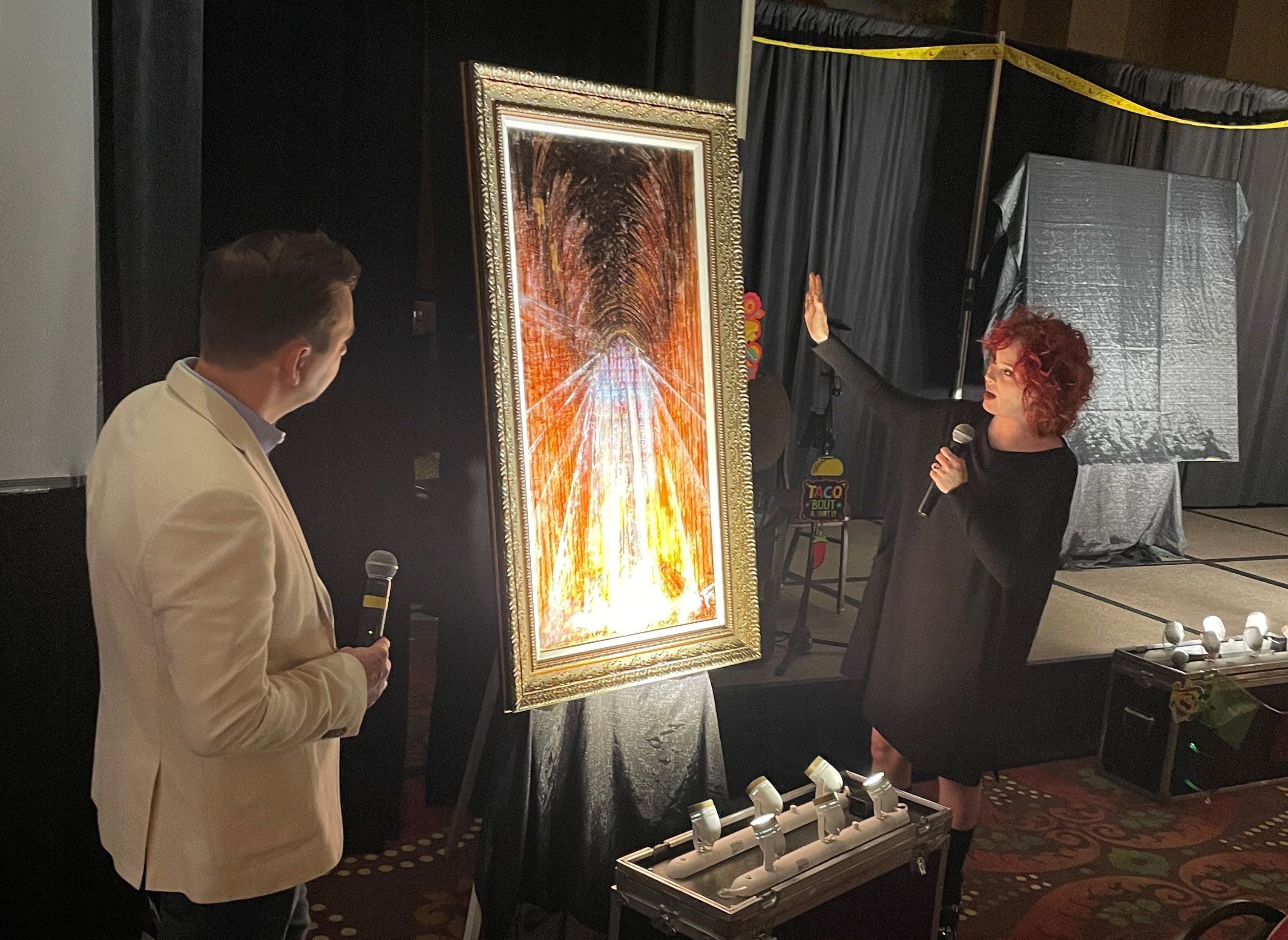 If you collect fine art from Park West, you may already be familiar with the global phenomenon that is Kre8 – a former street artist who has taken the art world by storm with eye-popping, stirring, and evocative paintings. Kre8 brought 30 new paintings to Branson, where he served as the exciting opening act during this thrilling VIP weekend, and by the time the night was over, he celebrated his 35th sellout show! Per tradition, Kre8 was awarded the gavel from Waters’ very first auction as Principal Auctioneer!