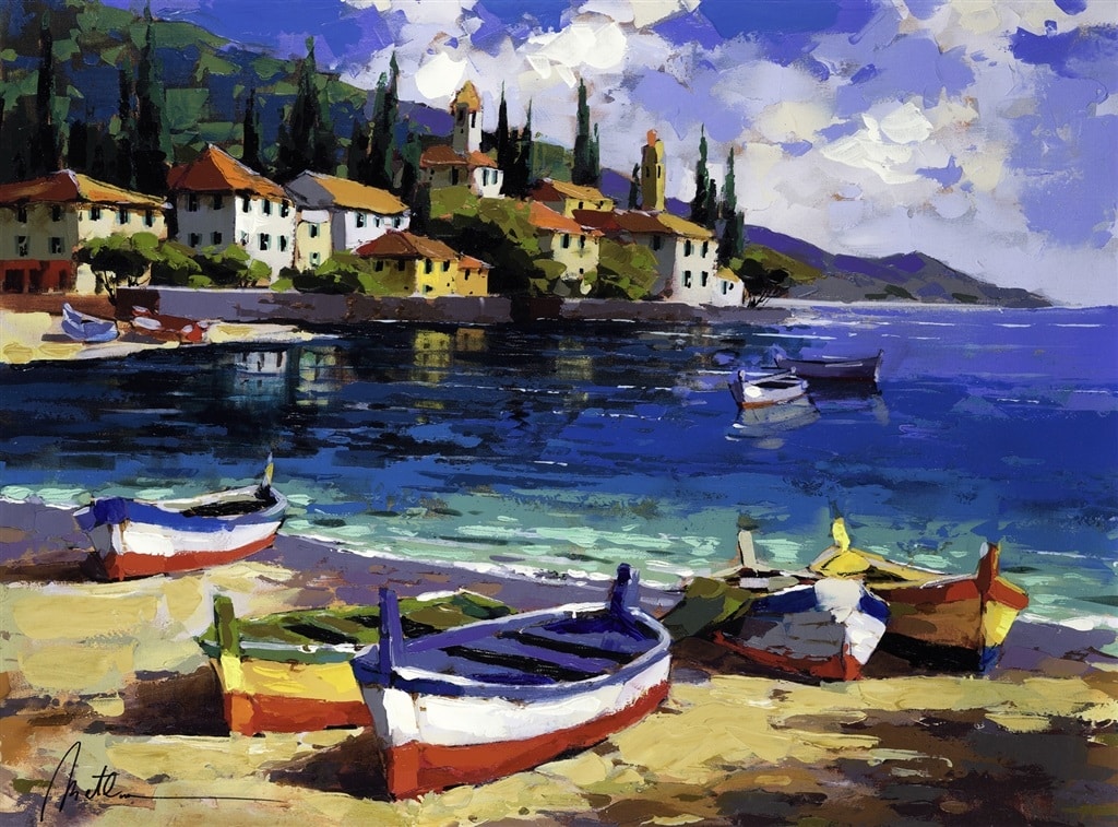 It’s Metlan’s travels through this magical region that serve as the basis for his landscapes and cityscapes. Metlan infuses his works with the tranquil atmosphere of the Mediterranean, portraying it in all its glory. He portrays colorful boats sailing along blue waters as morning sunlight pours from the sky, or welcoming homes lining narrow streets of coastal cities.