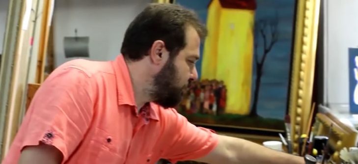 Mark Kanovich carefully adding details to one of his paintings.