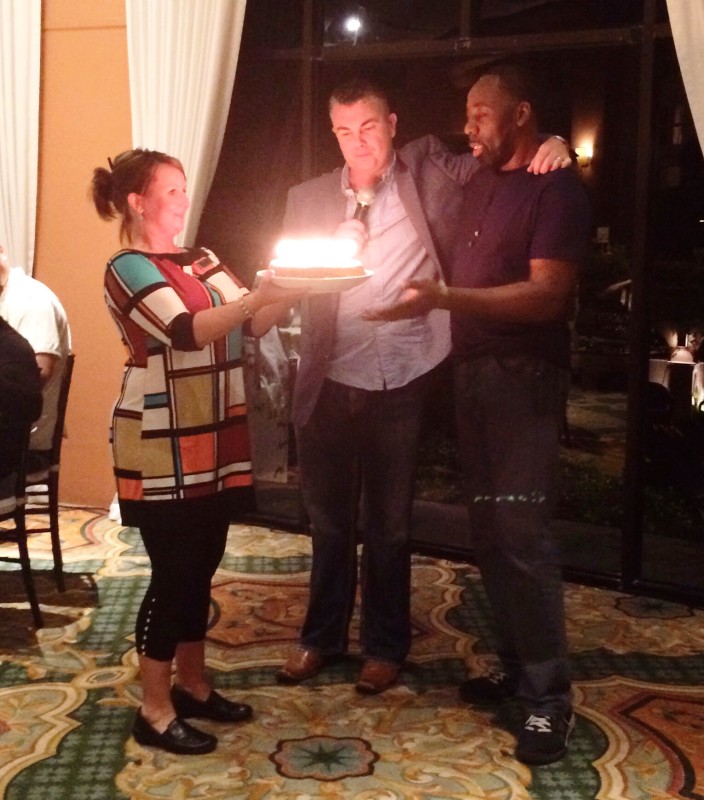 Hollis Standifer (on right) is presented with a cake celebrating his 20 years with Park West Gallery (Photo courtesy of Rob Ducat)