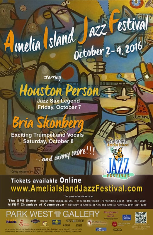 The official poster of the 2016 Amelia Island Jazz Festival, featuring art by Lebo.