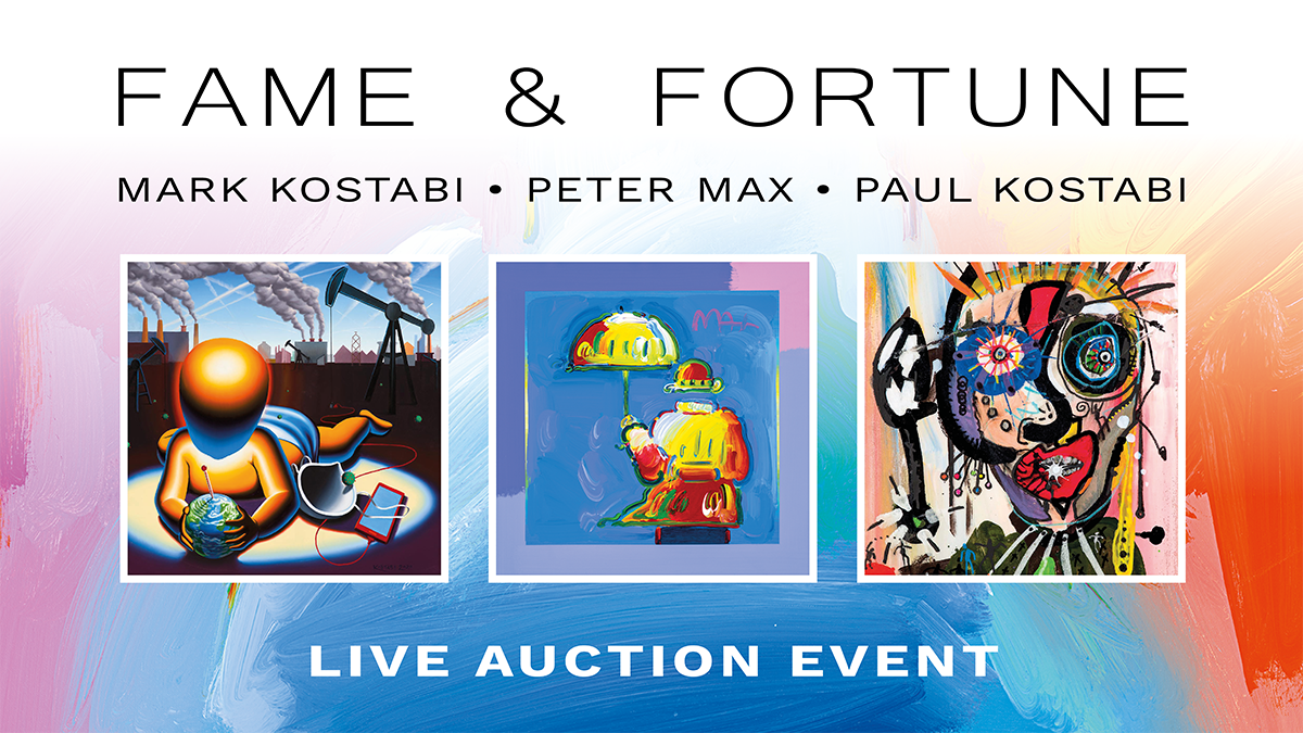 Park West Gallery SoHo is hosting a Live Auction featuring icons Mark Kostabi, Peter Max, and Paul Kostabi. The event will be conducted by John Block, certified auctioneer, and Park West Executive Vice President. The auction will take place on May 9th, 2024, from 5-8pm, at Park West Gallery SoHo located at 411 W Broadway, New York, NY 10012. Doors open at 4:30pm.