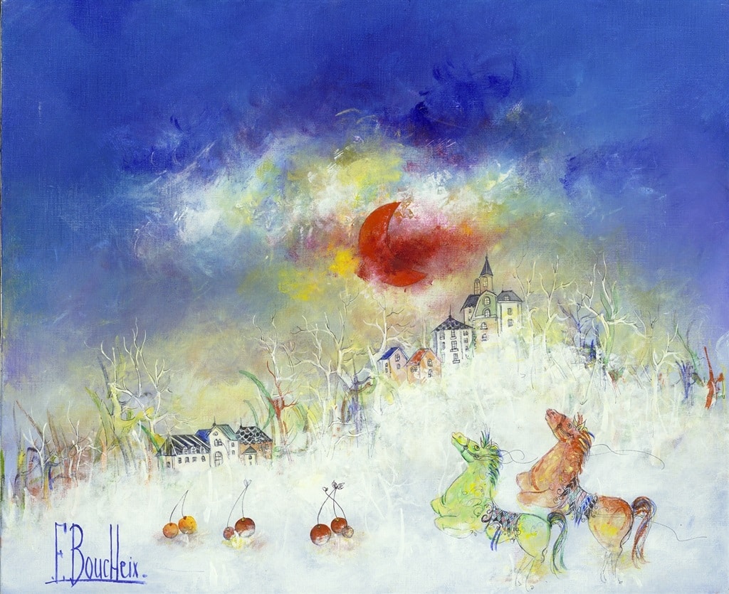 Surrealist painter François Boucheix said the desire for more romantic canvases led him to the “happy” Surrealism revealed by his artwork. In 1965, he abandoned traditional Surrealism and turned his creative energies to a world that was dreamy and colorful. “Success was immediate for me,” he said.