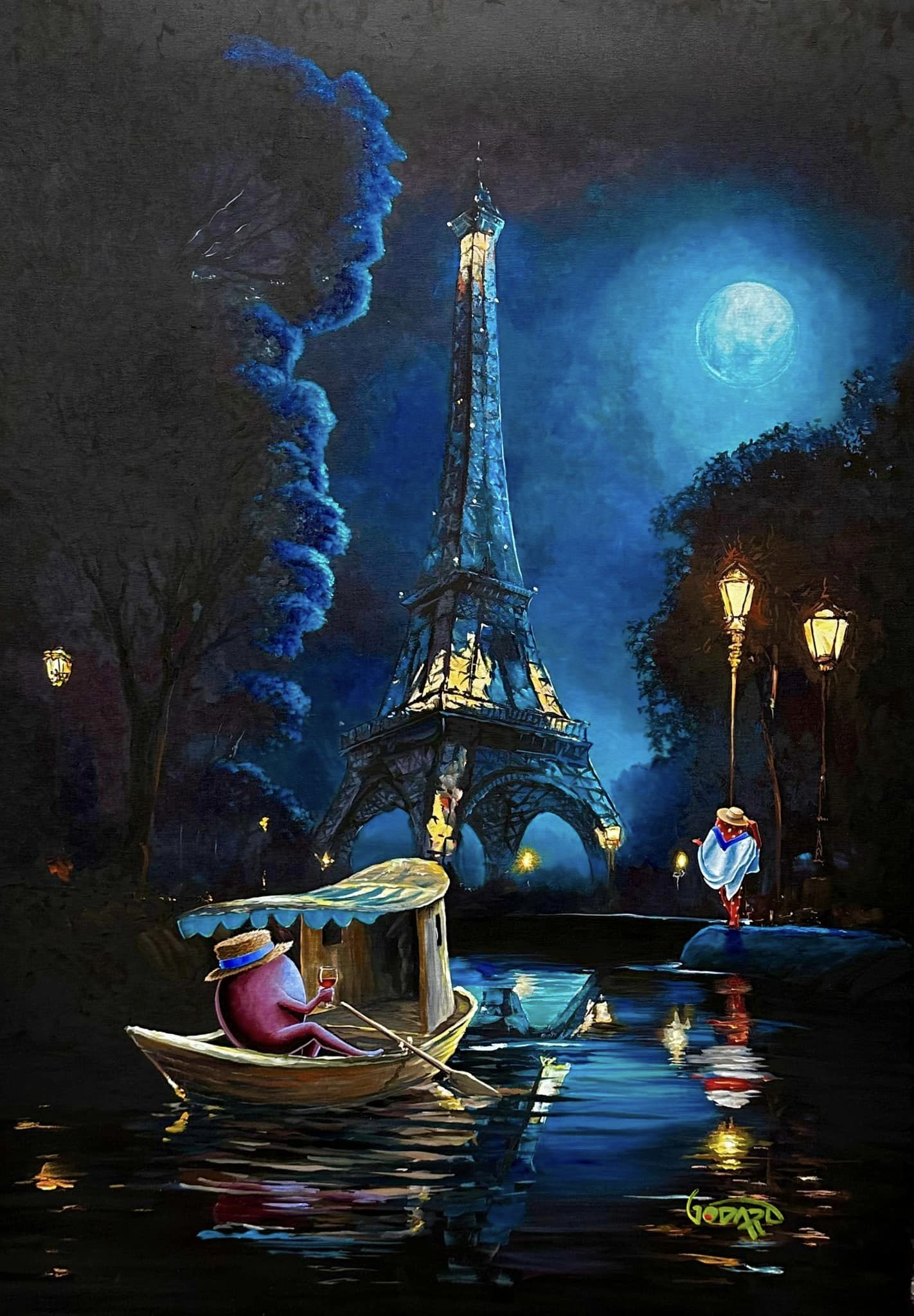 Before stopping in France this week, Godard teased an intoxicating painting that featured one of his famous olives on a slightly smaller vessel than the Constellation, with a glass of red wine in hand, floating serenely along the River Seine on a moonlit evening toward the Eiffel Tower luminous in the glow of street lamps. You can almost hear the olive say in perfect French, “Bon soir, mon ami.” In under 24 hours, there were already well over a hundred comments with clever title suggestions for him to consider.