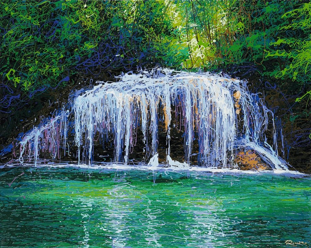 Michael Romero developed a new style of painting he considers a mixture of Impressionism, Abstract Expressionism, and Realism. Using a small metal coil, Romero splatters paint across the canvas in a circular motion. The effect creates a detailed, realistic painting from a distance, but reveals a splattered aesthetic upon closer inspection.
