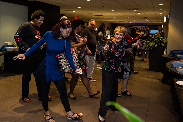 Park West Foundation Co-Founder Mitsie Scaglione enjoys a dance with students and attendees.