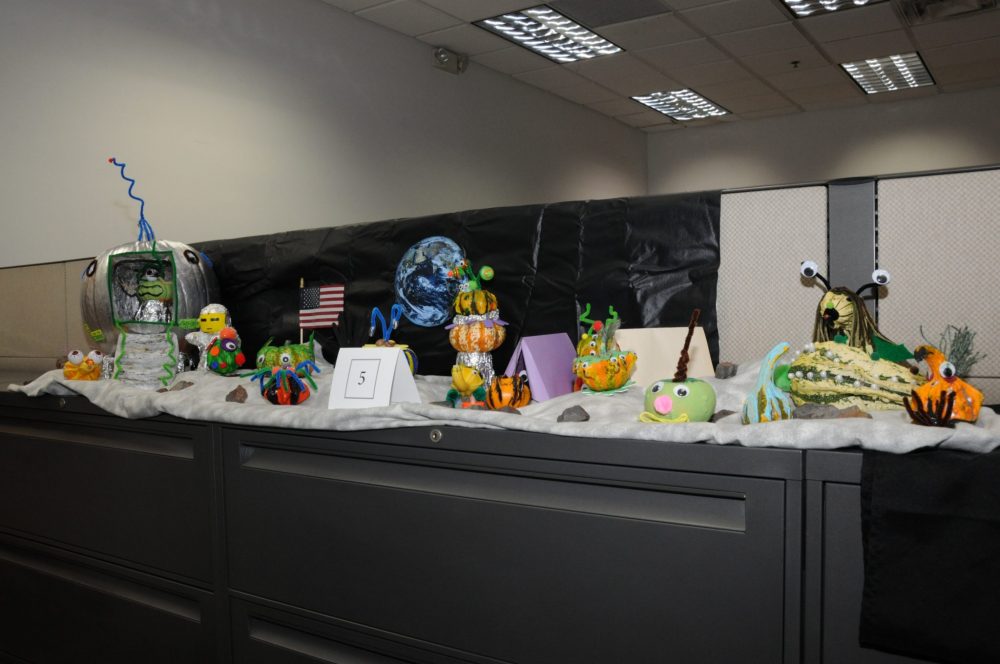 This diorama shows a pumpkin spaceship landed on a planet inhabited by goofy alien gourds.