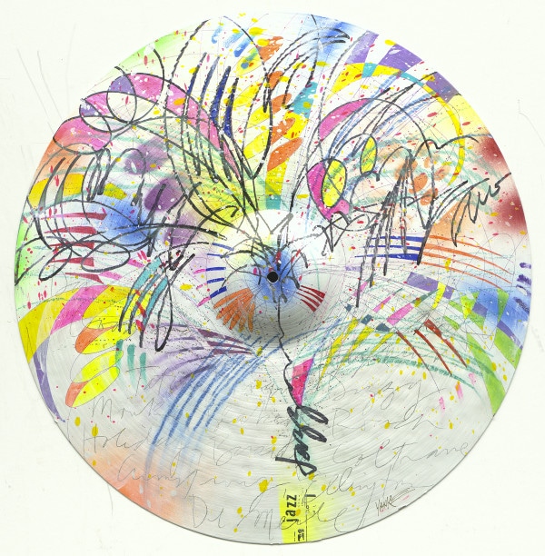 The works, both titled “Legends,” feature a fountain of color swirling out of the word “jazz,” while the names of jazz greats adorn the blank spaces. One work is on a canvas, while the other used a 22-inch Zildjian cymbal as the canvas.