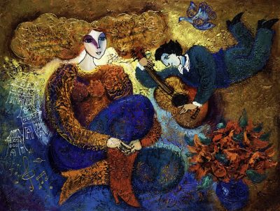 Yulia Langer was born in Kharkiv, Ukraine in 1972. After studying Art in Skovoroda, Kharkiv National University, Yulia continued on to teach Fine Arts for a number of years. Yulia Langer canvases are a fusion of story, form and colour. Romance and intimacy are reoccurring themes in her paintings, while in the background the viewer will find motifs of surrealism and naivety along with a certain musical subtext.