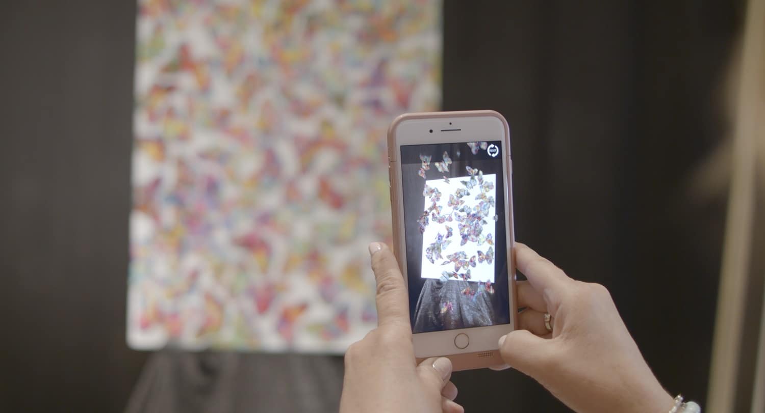 A collector watches as the butterflies on Yanke’s new augmented reality art form an infinity symbol.