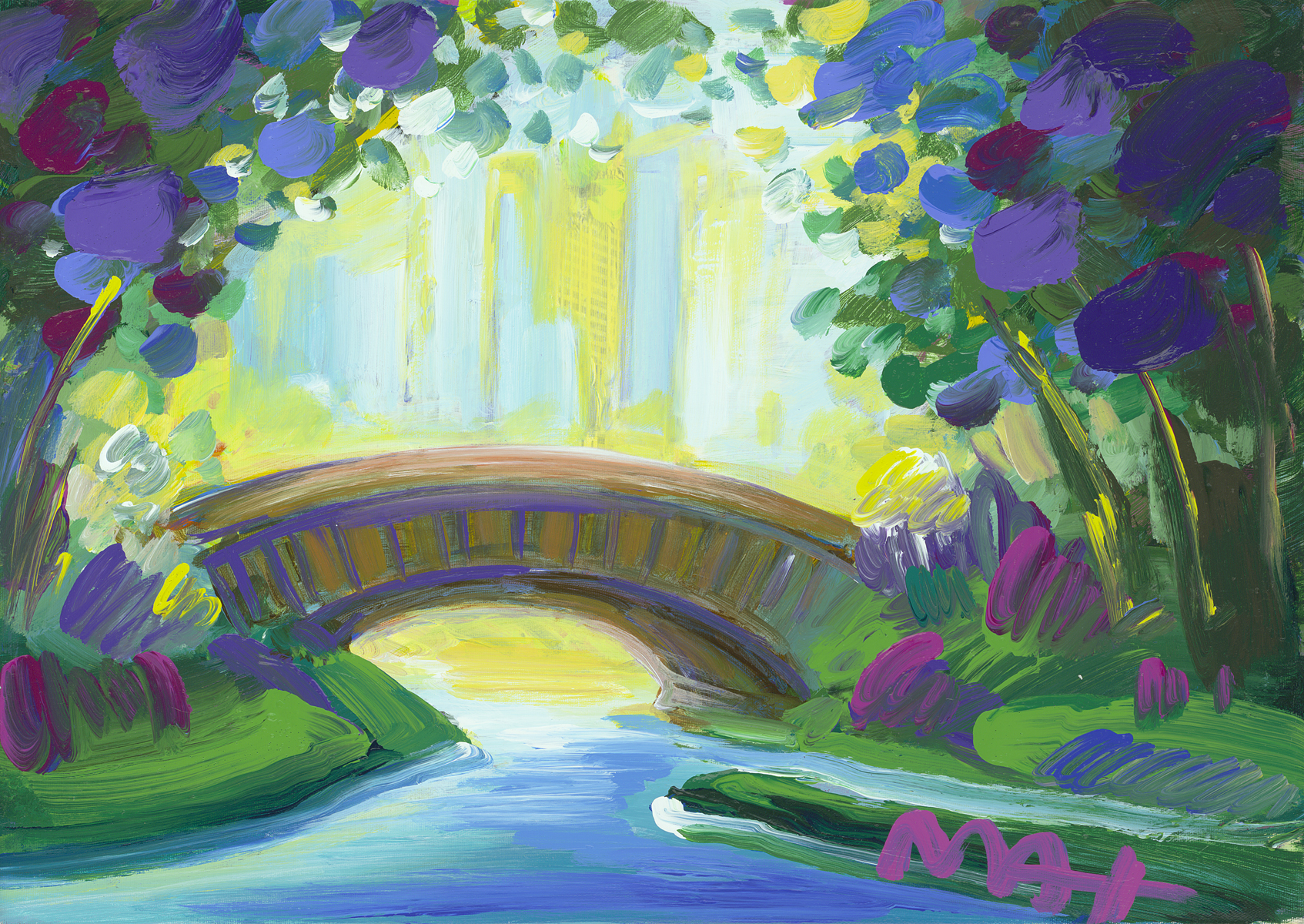 Mixed media painting on canvas from the Peter Max Studio. Hand-signed in pigment lower right by the artist.